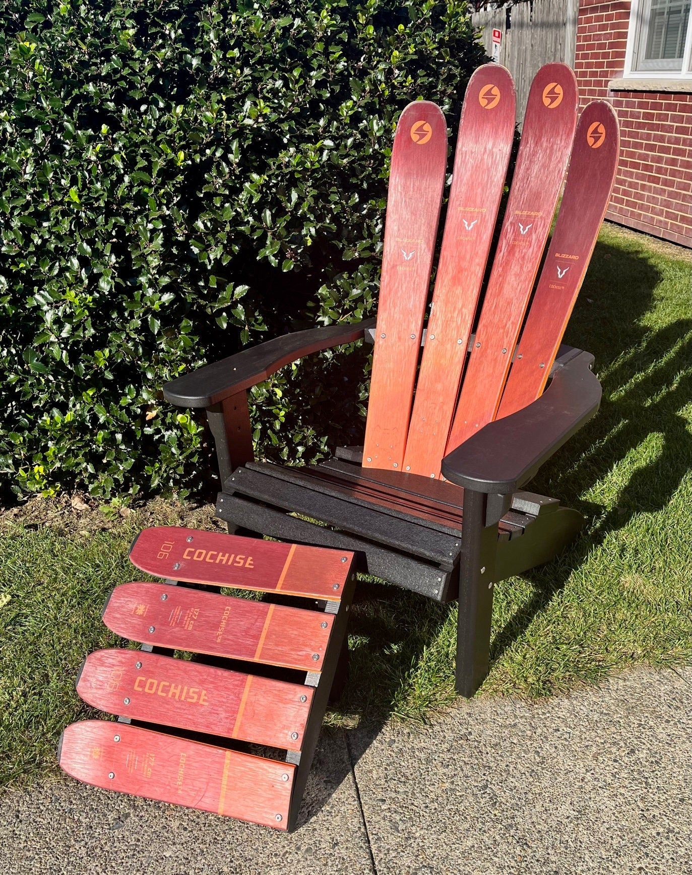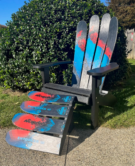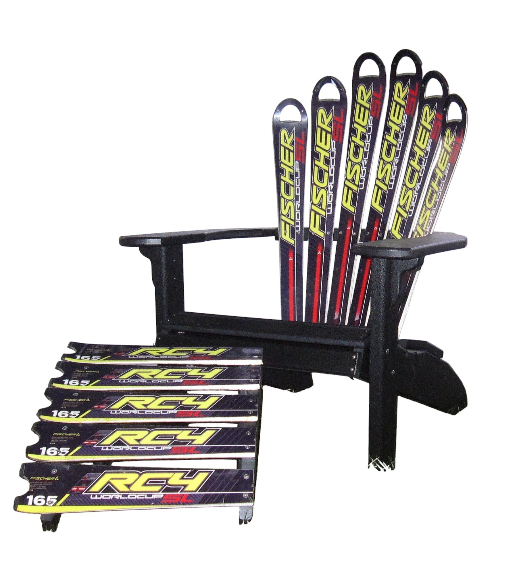 Hand Made Skichairs, complete with matching ottoman, are the finest Adirondack style chairs available. Skichairs are 100% handmade in the USA by a Skichair artisan with Plastic Lumber that will last forever and is the finest most durable material for outdoor use and assembled with stainless steel fasteners. Skichairs have a curved back for maximum comfort and extra long arms to accommodate not 1, but 2 drinks per arm!