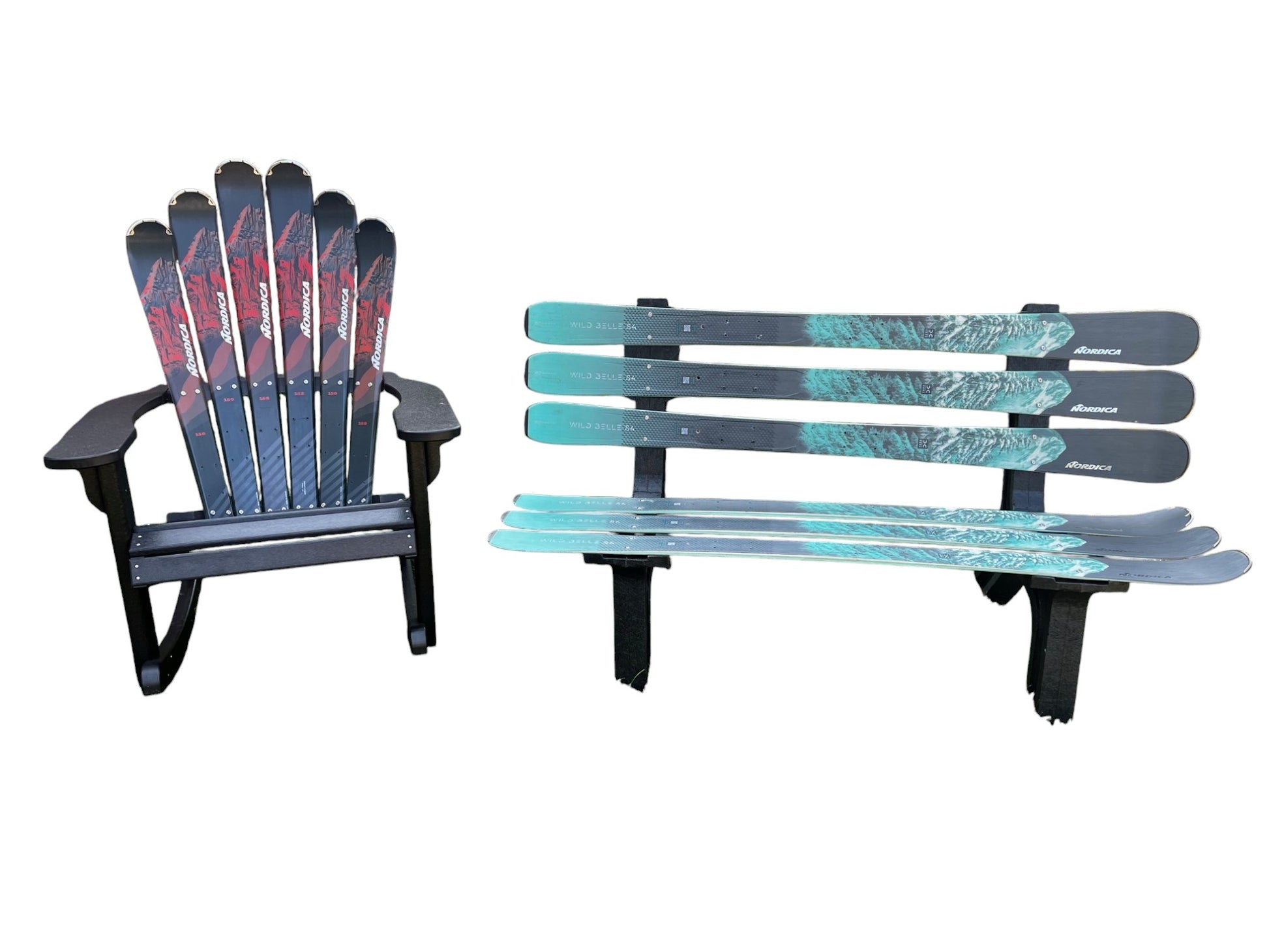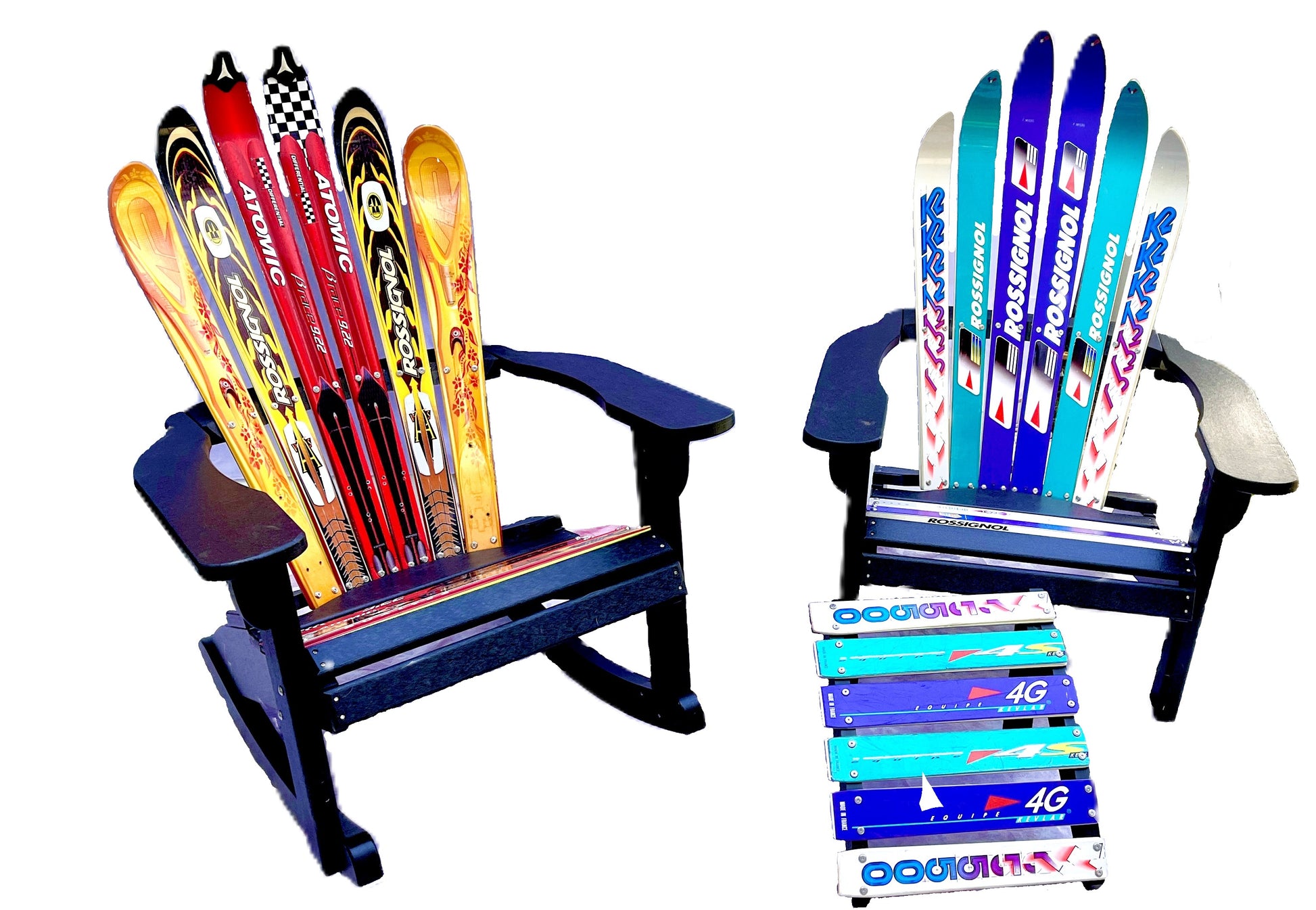 A 3 piece set of Skichairs, a snow ski Adirondack Skichair with an ottoman, Ski Rocker and a Ski or Snowboard bench.