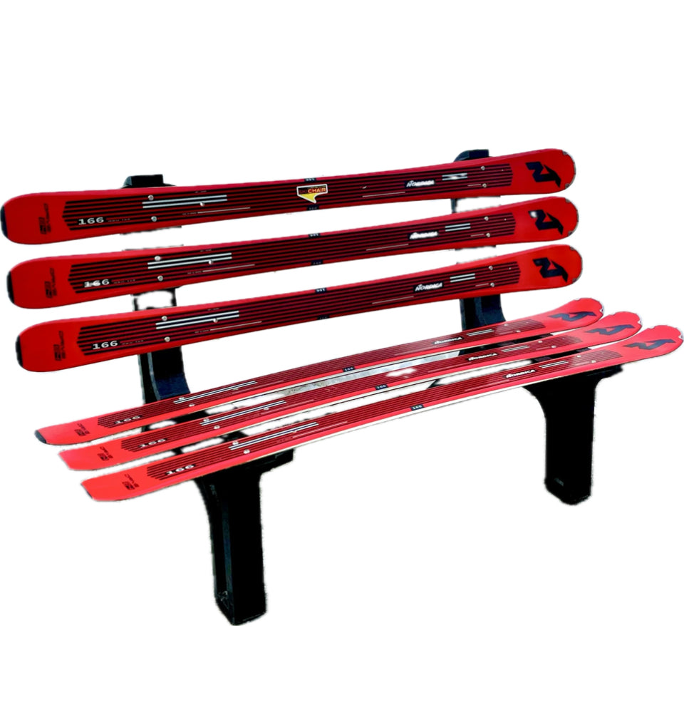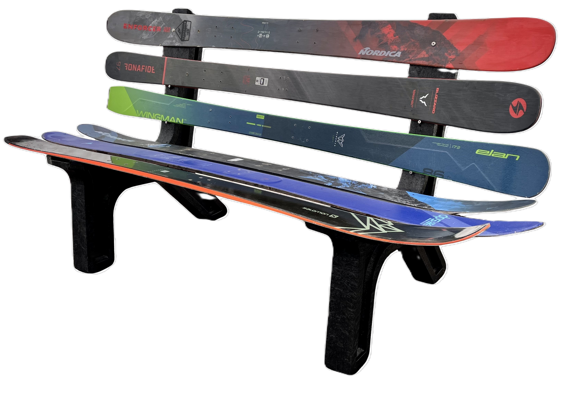 Benches are made entirely of recycled products and utilize recycled skis and boards. The Bench legs are made from recycled plastic and weigh 30lbs each. The recycled plastic legs are available in black.