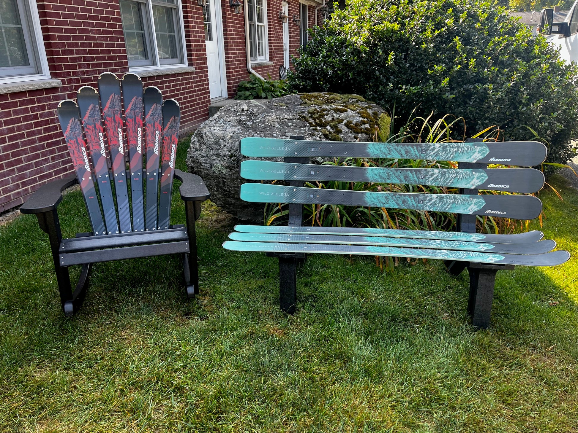 A 2 piece set of Skichairs, a snow ski Adirondack Skichair or Rocker and a Ski or Snowboard Bench.