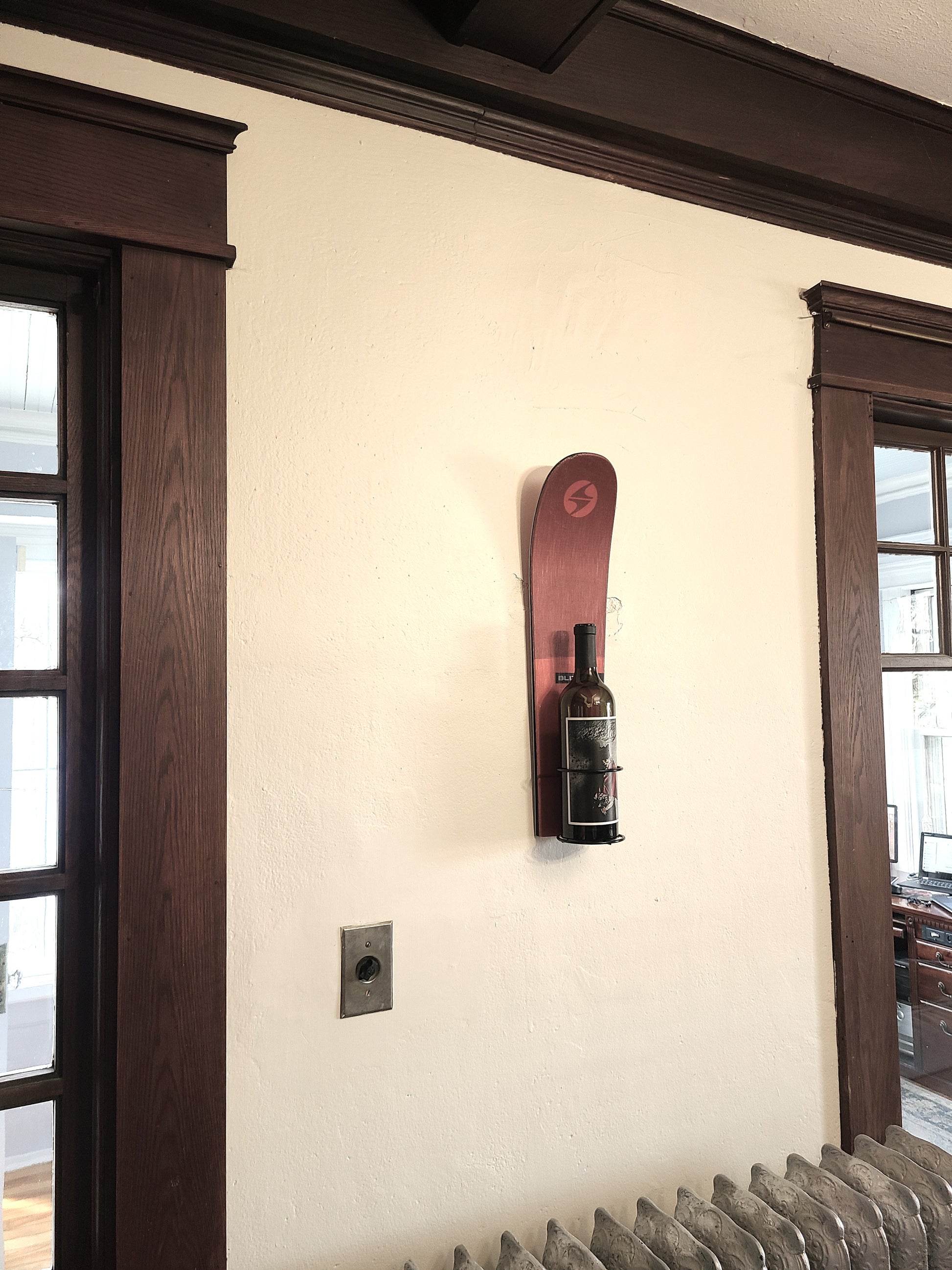 You don't have to be a wine connoisseur or an expert skier to appreciate this innovative way to display your favorite vino. The bottles are stored on their sides to properly maintain the wine's integrity, while the reclaimed skis, slightly weathered from use, add a touch of fun and excitement.